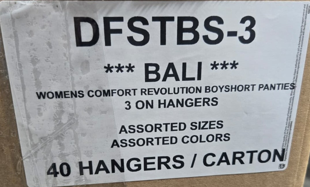 STYLE: DFSTBS-3DESCRIPTION: BALI LADIES COMFORT REVOLUTION BOYSHORT PANTIESCOLORS: AssortedSIZES: AssortedPER CASE: 40