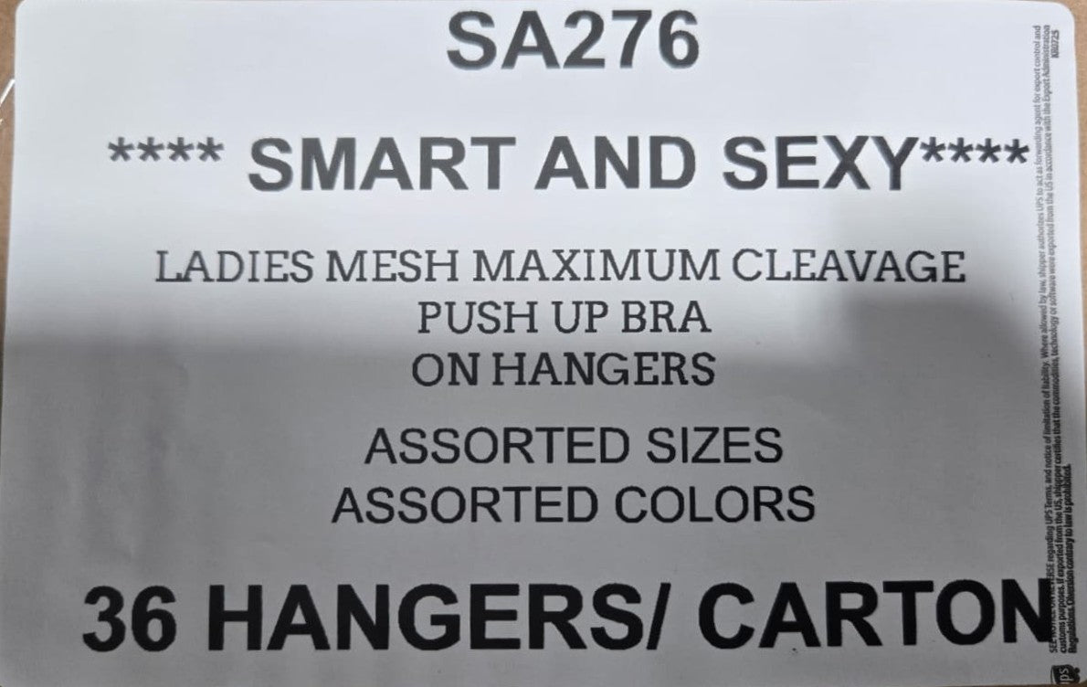 STYLE: SA276DESCRIPTION: SMART AND SEXY LADIES MESH MAXIMUM CLEAVAGE PUSH UPCOLORS: AssortedSIZES: AssortedPER CASE: 36